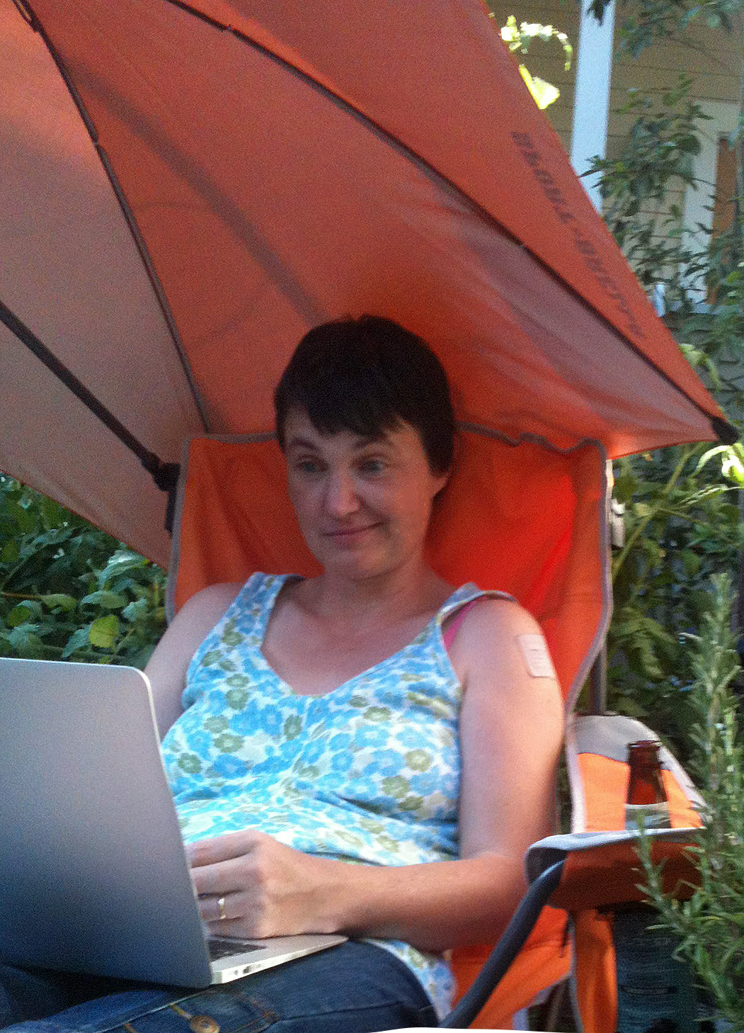 Also of note is this horrible picture of me, which shows the totally awesome chair I bought when I finished edits for SYT (my little reward). “A chair?” you ask. Yes, a chair, or, as I think of it now, my remote office. See, the husband makes me go camping, plus I like to sit outside in the summer and write there, so dammit, I’m doing it with a drink holder, an umbrella and a foot rest, (plus an insulated pocket in the other arm for snackies, and various compartments for whatever). My daughter took this picture. I hate it, but it makes me laugh.