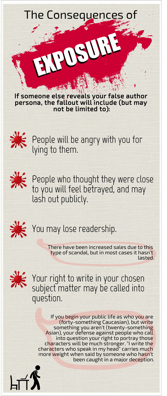 that other people will judge them. While I may (or may not, in some cases) be able to understand why authors seriously misrepresent themselves, I can’t help wondering (as I’m parsing the details in my mind later, looking for the clues I missed about their true identity), Did they really think about the consequences of doing this?