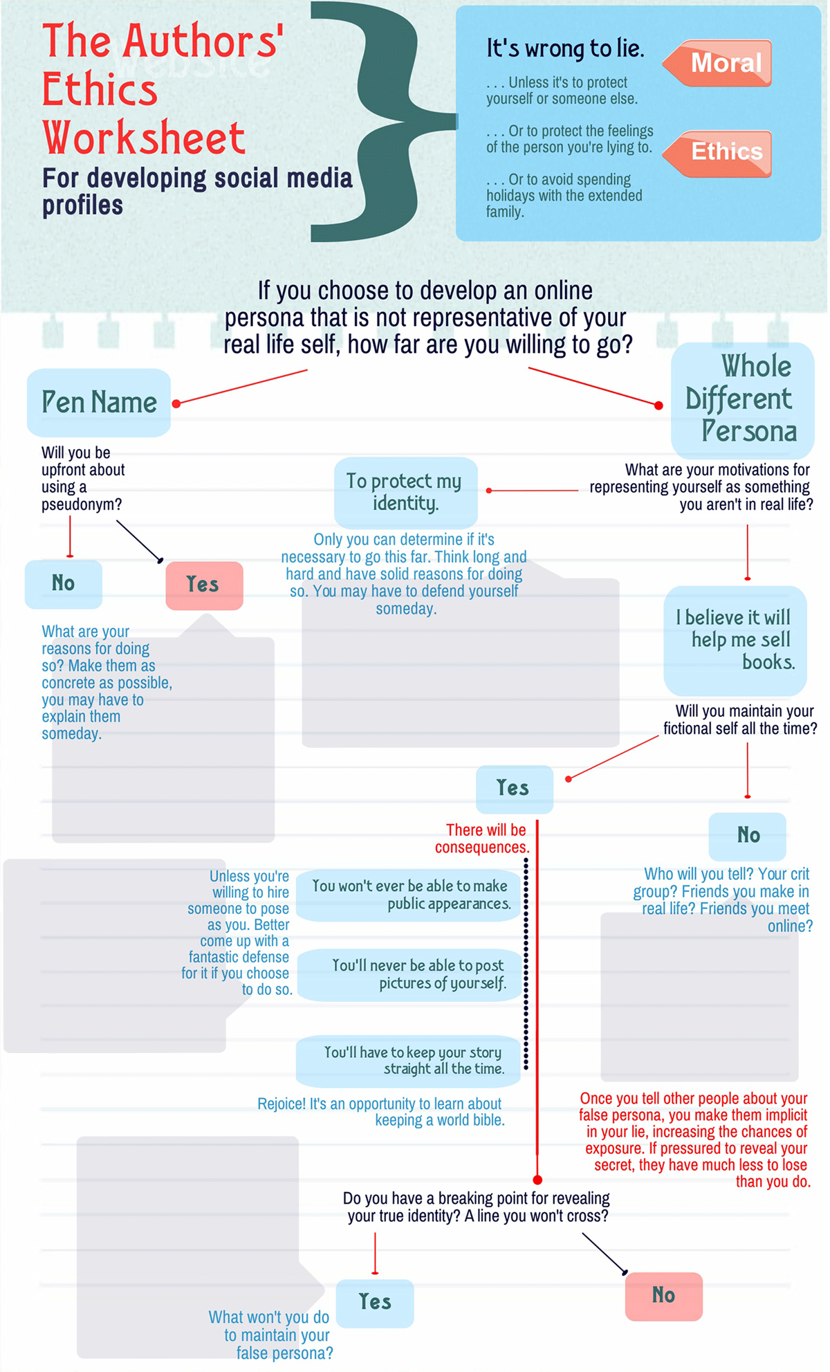 To that end, I’ve created yet another handy graphic, “The Authors’ Ethics Worksheet” for anyone who’s thinking about creating a fictional self along with their fiction.