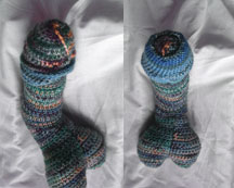 Here’s the basics (from what I can remember, since I usually sort of make it up as I go): You need a very elastic yarn, preferably a sock yarn with actual elastic in it. I used (mostly) Cascade Fixation. Anyway, somewhere as I’m crocheting the shaft I start working in the elastic yarn, then just before I get to the head, I do a round with the two yarns separated (shaft versus foreskin), with the shaft yarn worked into the back loop only and the foreskin yarn in the front loop only. I drop the foreskin yarn, complete the head (don’t forget the corona—you’ll be able to see it under the foreskin if you make it big enough), then start the foreskin, first adding a number of stitches to make it big enough, then necking it in as the head tapers under it.